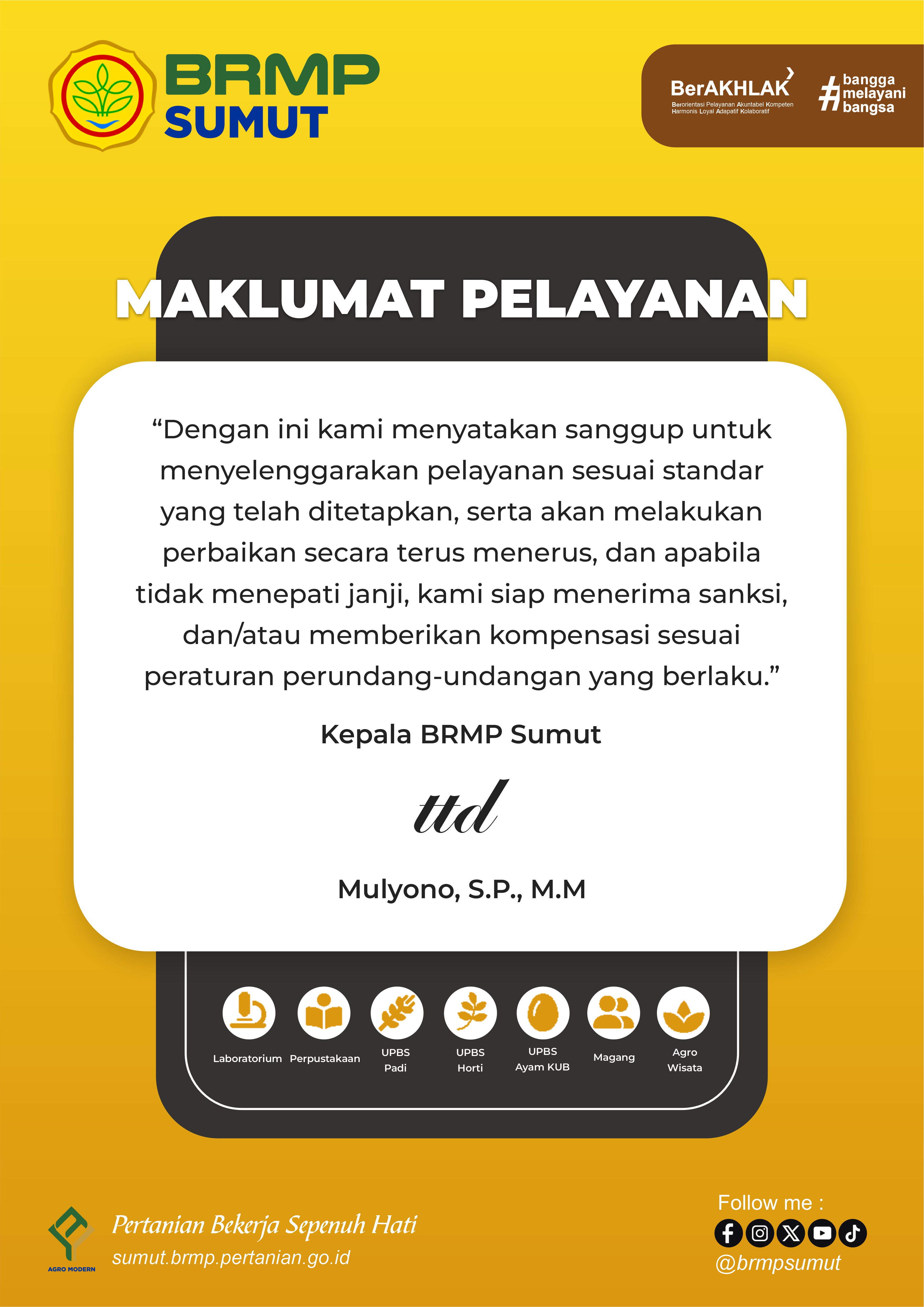 Sebagai badan publik, BRMP Sumatera Utara berkomitmen menyelenggarakan pelayanan sesuai standar dan peraturan perundang-undangan. BRMP Sumatera Utara memastikan setiap masyarakat dapat memperoleh layanan dengan mudah dan cepat. Komitmen ini tidak hanya menunjukkan dedikasi BRMP Sumut dalam melayani masyarakat, tetapi juga menjadi cerminan dari upaya untuk meningkatkan kualitas layanan publik di sektor pertanian.